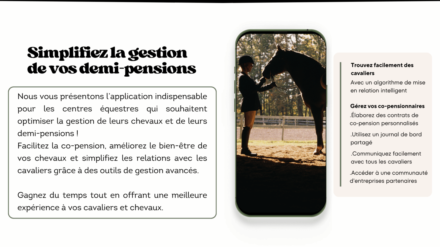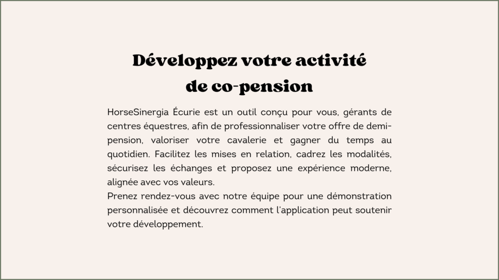 HorseSinergia Écurie centralise la gestion de vos demi-pensions : vous pouvez créer vos contrats, organiser vos plannings de soins et de monte, suivre l’utilisation de vos chevaux et communiquer facilement avec vos cavaliers. Tout est regroupé dans une seule application claire et simple à utiliser.
